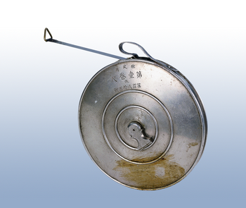 特色:早期的捲尺以布做材料,稱為布尺。布尺使用久了會不準確,因此需要檢定,以確定其合乎國家標準,市場交易才不致因度量不準確而產生糾紛。 「檢定用第一捲尺」是由日據時期留下來迄今,日據時期及台灣光復早期台灣省度量衡檢定所用來檢定布尺精確度的檢驗器具。捲尺上的「檢定用」表示是該所攜出該器具到外面執行檢定;「第一」表示是第一標準;而「第百八拾五號」則是捲尺的編號。
