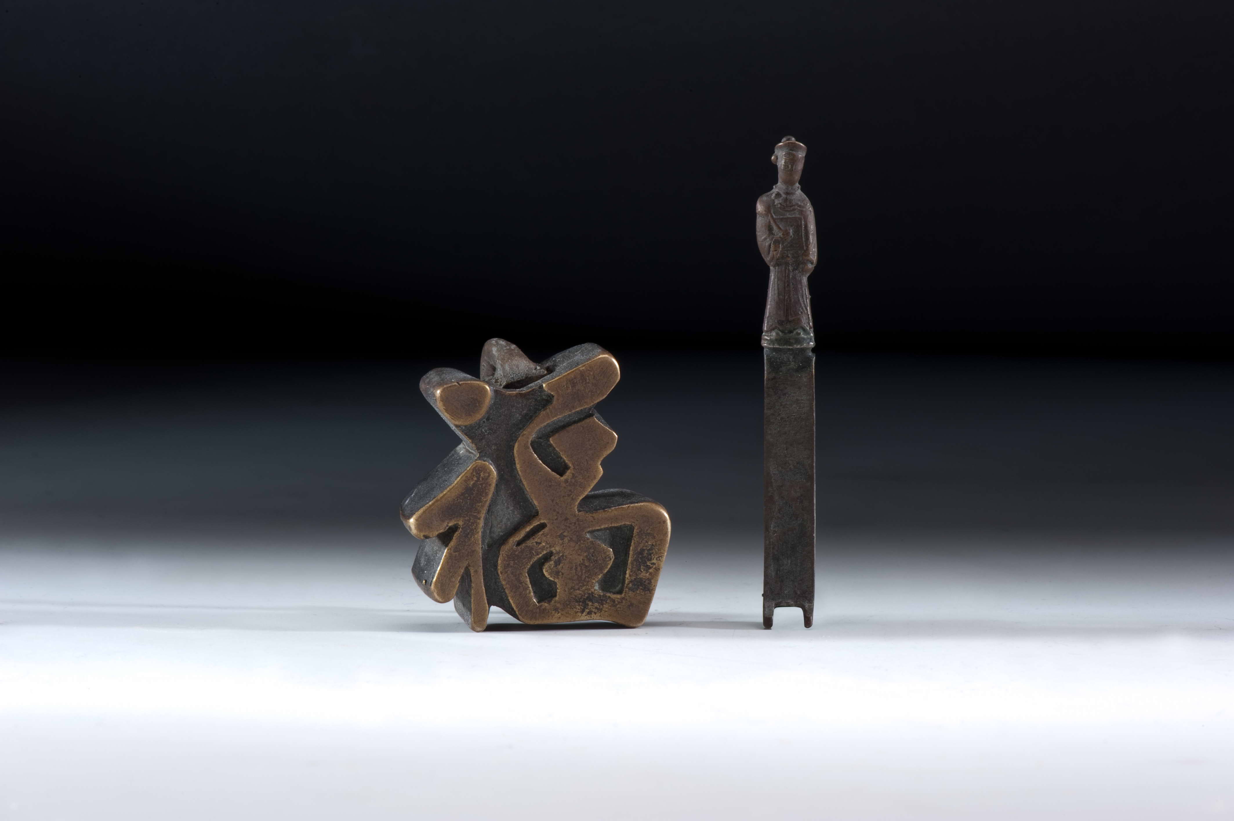特色:根據設計原理的不同,古中國的鎖具可分為簧片掛鎖與組合鎖兩大類。簧片掛鎖是古中國最常使用的鎖具,其利用簡單的彈簧彈力及巧妙的幾何尺寸安排,配合鑰匙的設計,產生開鎖與閉鎖的功能。根據外型的不同,又可以分成廣鎖與花旗鎖兩類。廣鎖的正面呈凹字狀。「花旗鎖」常用於鎖抽屜、鎖櫃、鎖箱、…等,「花」是指花樣,「旗」則有表示的意思,其名稱來自於其特殊且多樣化的外形,可概分為人物、動物、樂器、字形、用品、及其它等類型,除了含有特定的寓意與吉祥之意外,亦兼具裝飾功能。再者,花旗鎖大多為銅質,鐫雕洗練,工寫兼蓄,作工精緻傳神,頗富民族傳統色彩。此物件為福字外型的花旗鎖。