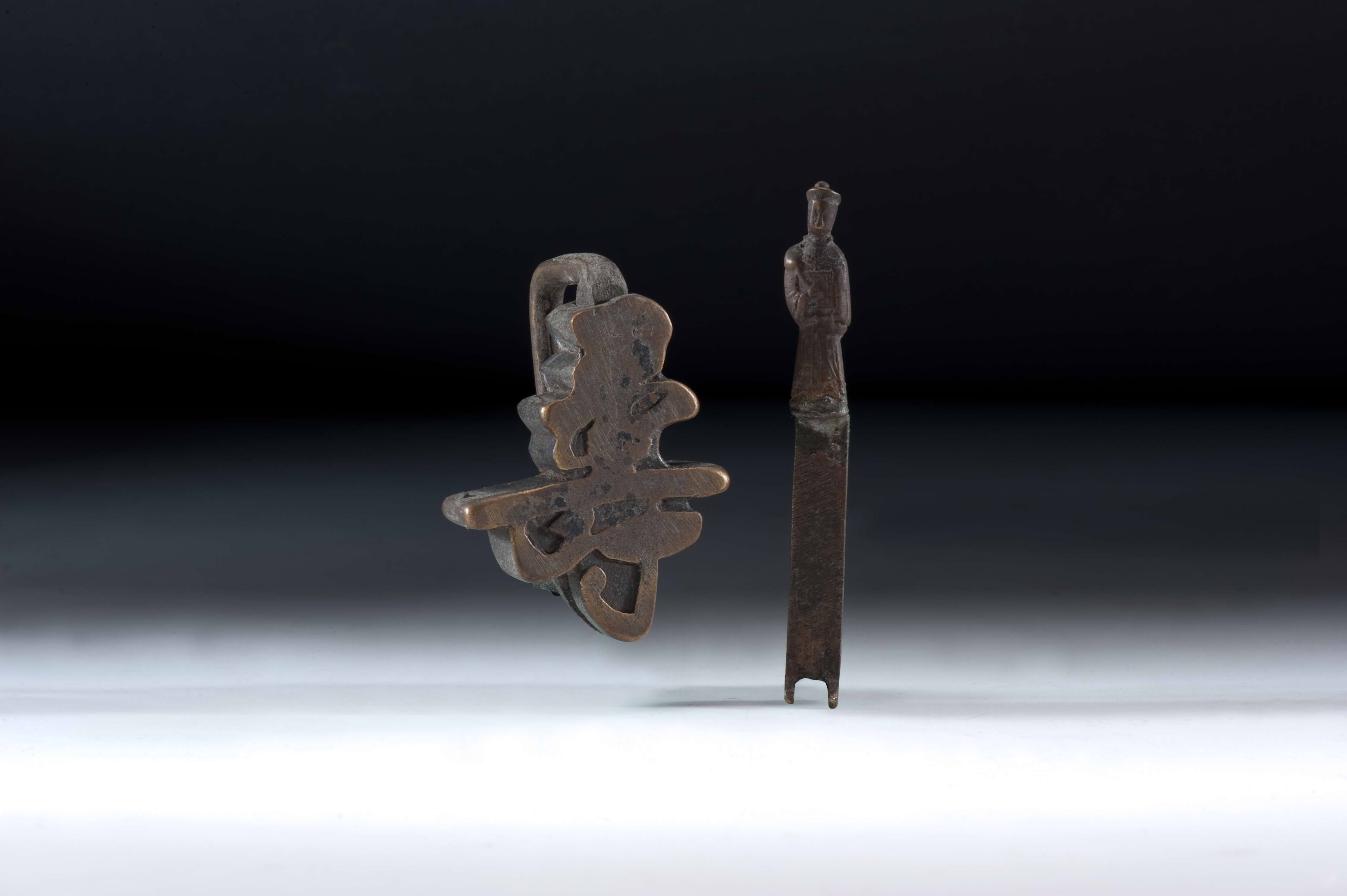 特色:根據設計原理的不同,古中國的鎖具可分為簧片掛鎖與組合鎖兩大類。簧片掛鎖是古中國最常使用的鎖具,其利用簡單的彈簧彈力及巧妙的幾何尺寸安排,配合鑰匙的設計,產生開鎖與閉鎖的功能。根據外型的不同,又可以分成廣鎖與花旗鎖兩類。廣鎖的正面呈凹字狀。「花旗鎖」常用於鎖抽屜、鎖櫃、鎖箱、…等,「花」是指花樣,「旗」則有表示的意思,其名稱來自於其特殊且多樣化的外形,可概分為人物、動物、樂器、字形、用品、及其它等類型,除了含有特定的寓意與吉祥之意外,亦兼具裝飾功能。再者,花旗鎖大多為銅質,鐫雕洗練,工寫兼蓄,作工精緻傳神,頗富民族傳統色彩。此物件為壽字外型的花旗鎖。