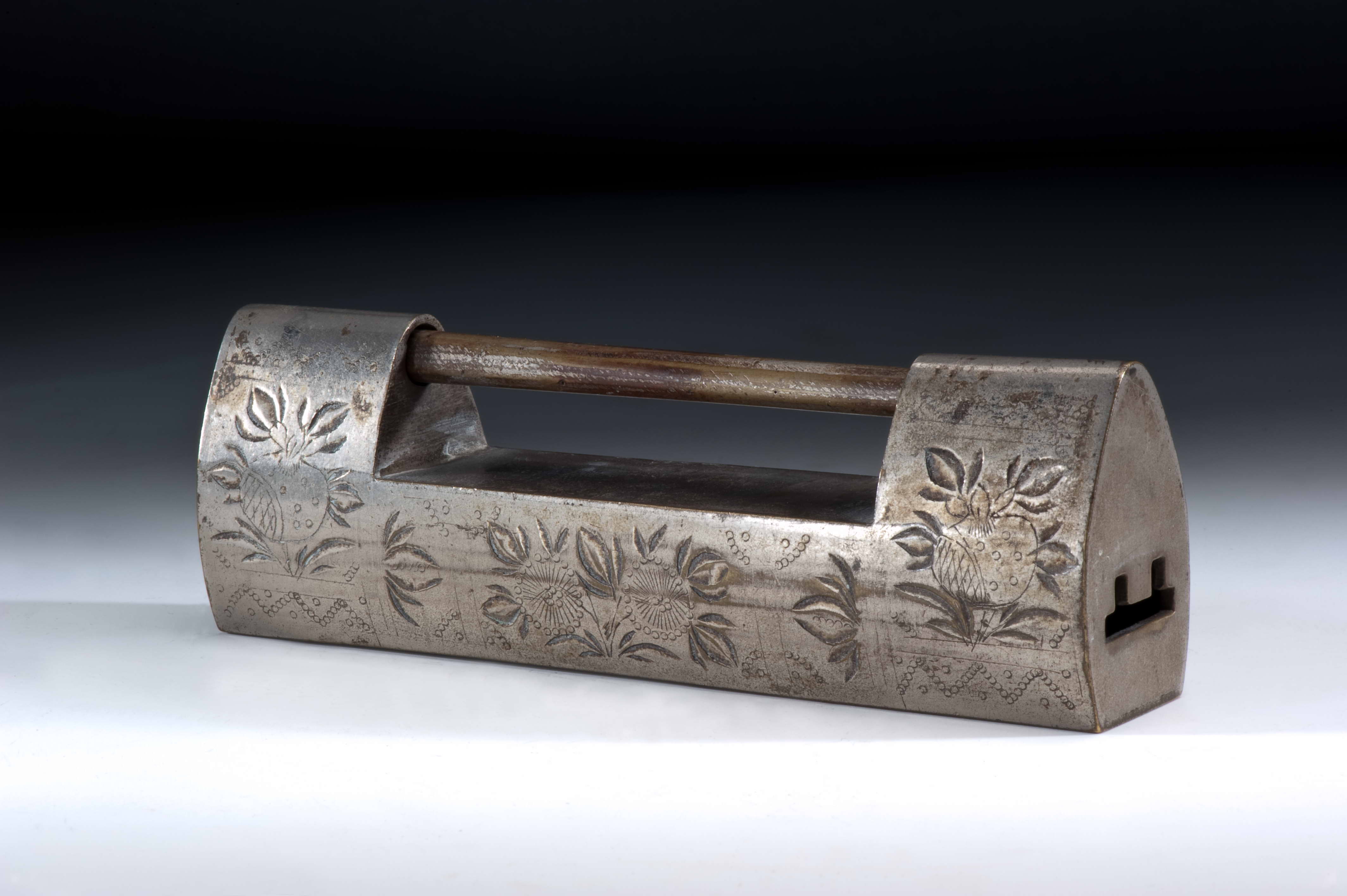 特色:根據設計原理的不同,古中國的鎖具可分為簧片掛鎖與組合鎖兩大類。簧片掛鎖是古中國最常使用的鎖具,其利用簡單的彈簧彈力及巧妙的幾何尺寸安排,配合鑰匙的設計,產生開鎖與閉鎖的功能。根據外型的不同,又可以分成廣鎖與花旗鎖兩類。廣鎖大多為銅質,外形似長方體,其鑰匙孔多位於鎖體側邊,少數位於鎖體正面或底面,廣泛應用於各種門窗、抽屜、及箱子中。花旗鎖的稱呼,來自於其特殊且多樣化的外形,除具有保護、防護的作用之外,亦深具藝術價值。此物件為蝕刻花草的廣鎖。