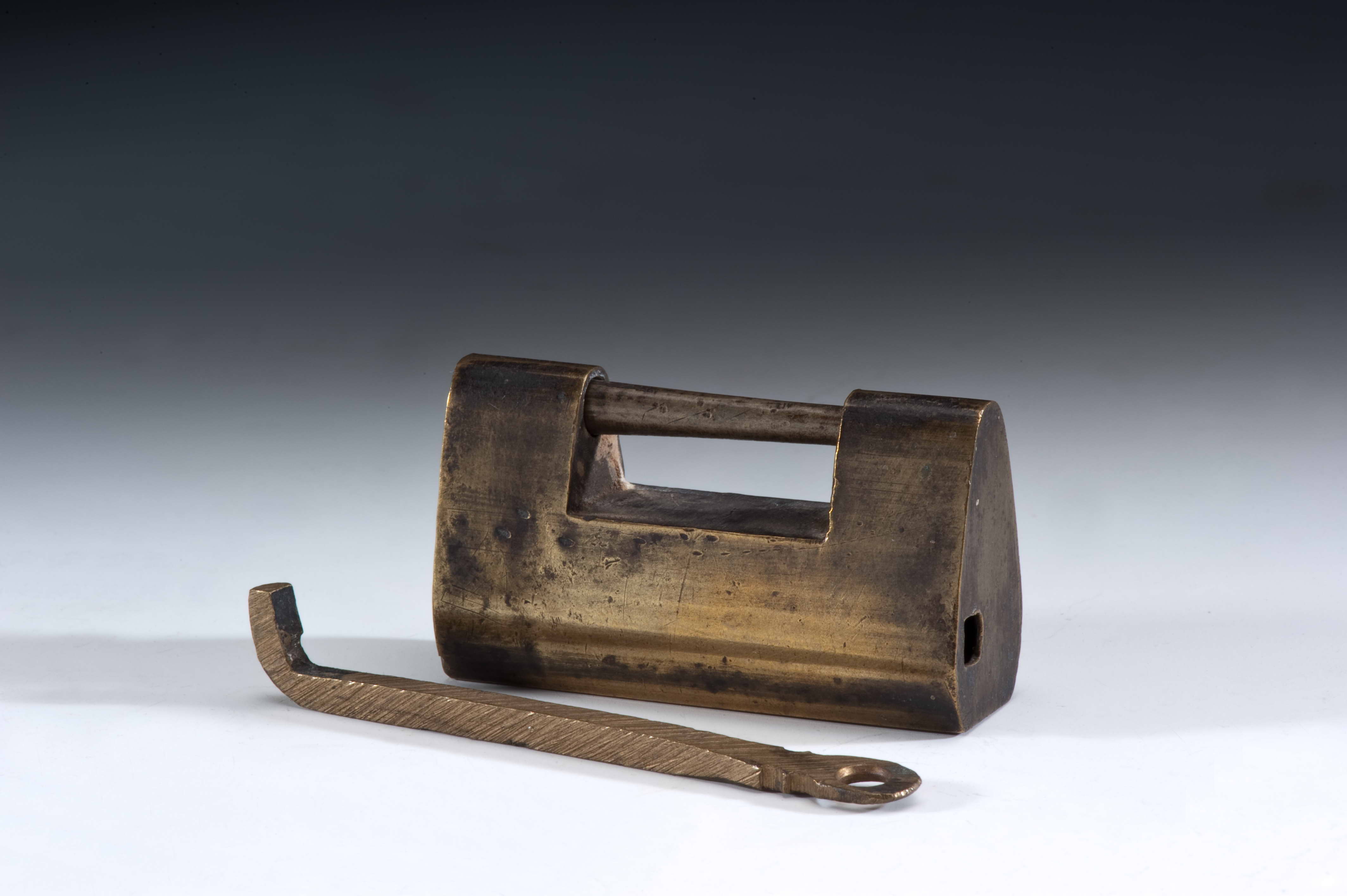 特色:根據設計原理的不同,古中國的鎖具可分為簧片掛鎖與組合鎖兩大類。簧片掛鎖是古中國最常使用的鎖具,其利用簡單的彈簧彈力及巧妙的幾何尺寸安排,配合鑰匙的設計,產生開鎖與閉鎖的功能。根據外型的不同,又可以分成廣鎖與花旗鎖兩類。廣鎖大多為銅質,外形似長方體,其鑰匙孔多位於鎖體側邊,少數位於鎖體正面或底面,廣泛應用於各種門窗、抽屜、及箱子中。花旗鎖的稱呼,來自於其特殊且多樣化的外形,除具有保護、防護的作用之外,亦深具藝術價值。此物件為開放式鎖孔的廣鎖。