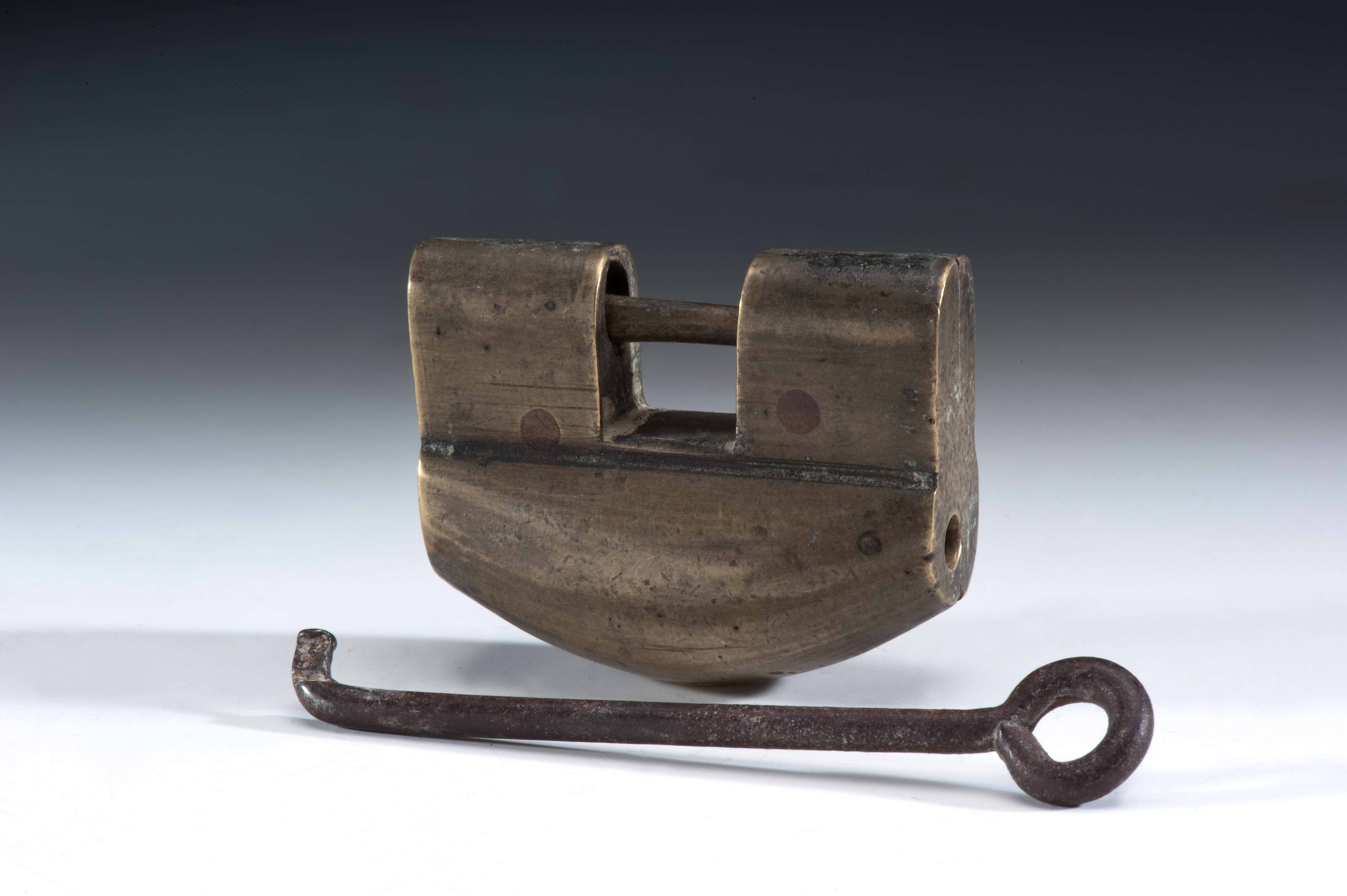 特色:根據設計原理的不同,古中國的鎖具可分為簧片掛鎖與組合鎖兩大類。簧片掛鎖是古中國最常使用的鎖具,其利用簡單的彈簧彈力及巧妙的幾何尺寸安排,配合鑰匙的設計,產生開鎖與閉鎖的功能。根據外型的不同,又可以分成廣鎖與花旗鎖兩類。廣鎖大多為銅質,外形似長方體,其鑰匙孔多位於鎖體側邊,少數位於鎖體正面或底面,廣泛應用於各種門窗、抽屜、及箱子中。花旗鎖的稱呼,來自於其特殊且多樣化的外形,除具有保護、防護的作用之外,亦深具藝術價值。此物件為特殊形狀的廣鎖。