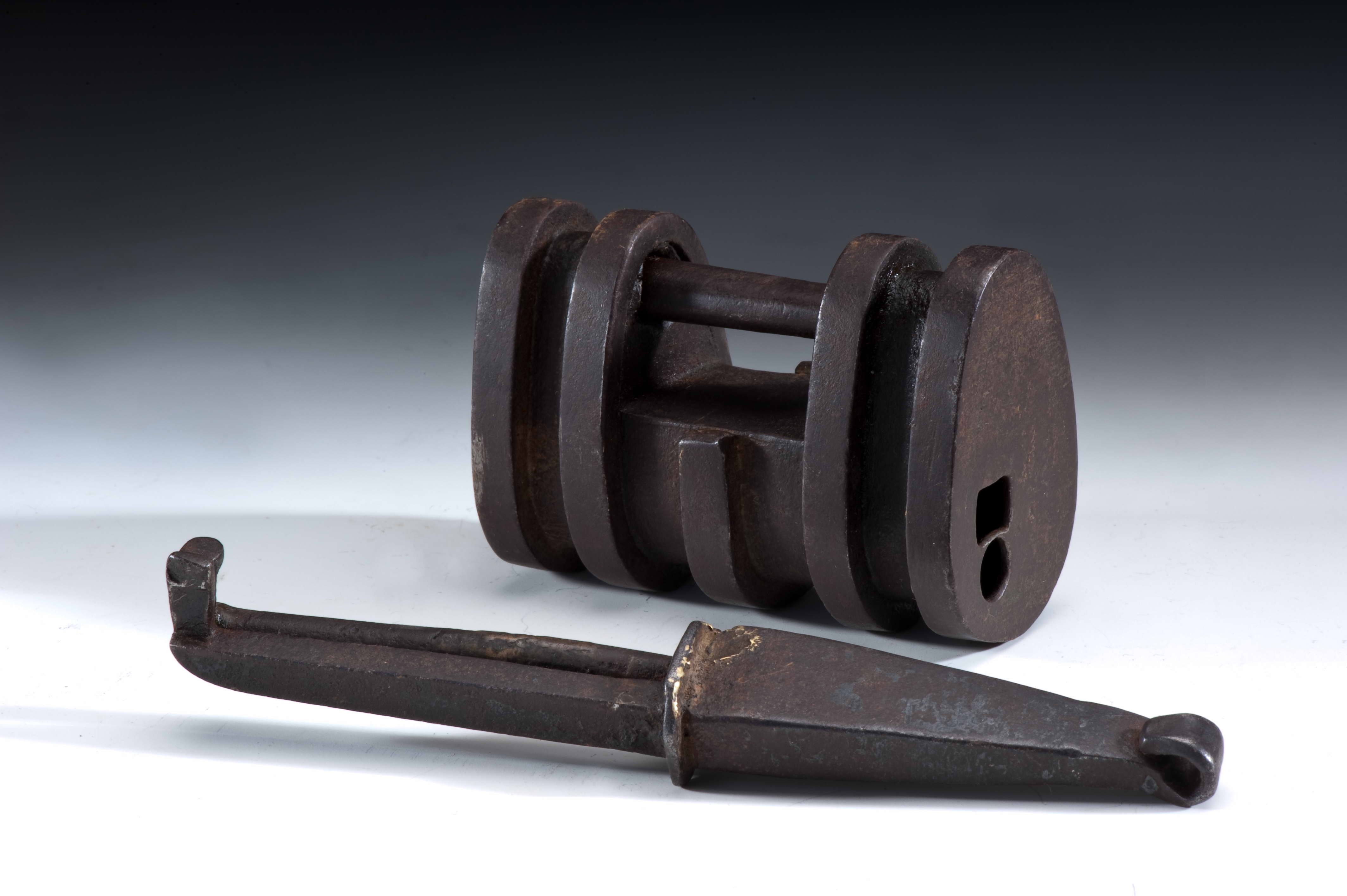 特色:根據設計原理的不同,古中國的鎖具可分為簧片掛鎖與組合鎖兩大類。簧片掛鎖是古中國最常使用的鎖具,其利用簡單的彈簧彈力及巧妙的幾何尺寸安排,配合鑰匙的設計,產生開鎖與閉鎖的功能。根據外型的不同,又可以分成廣鎖與花旗鎖兩類。廣鎖大多為銅質,外形似長方體,其鑰匙孔多位於鎖體側邊,少數位於鎖體正面或底面,廣泛應用於各種門窗、抽屜、及箱子中。花旗鎖的稱呼,來自於其特殊且多樣化的外形,除具有保護、防護的作用之外,亦深具藝術價值。此物件為特殊形狀的廣鎖。