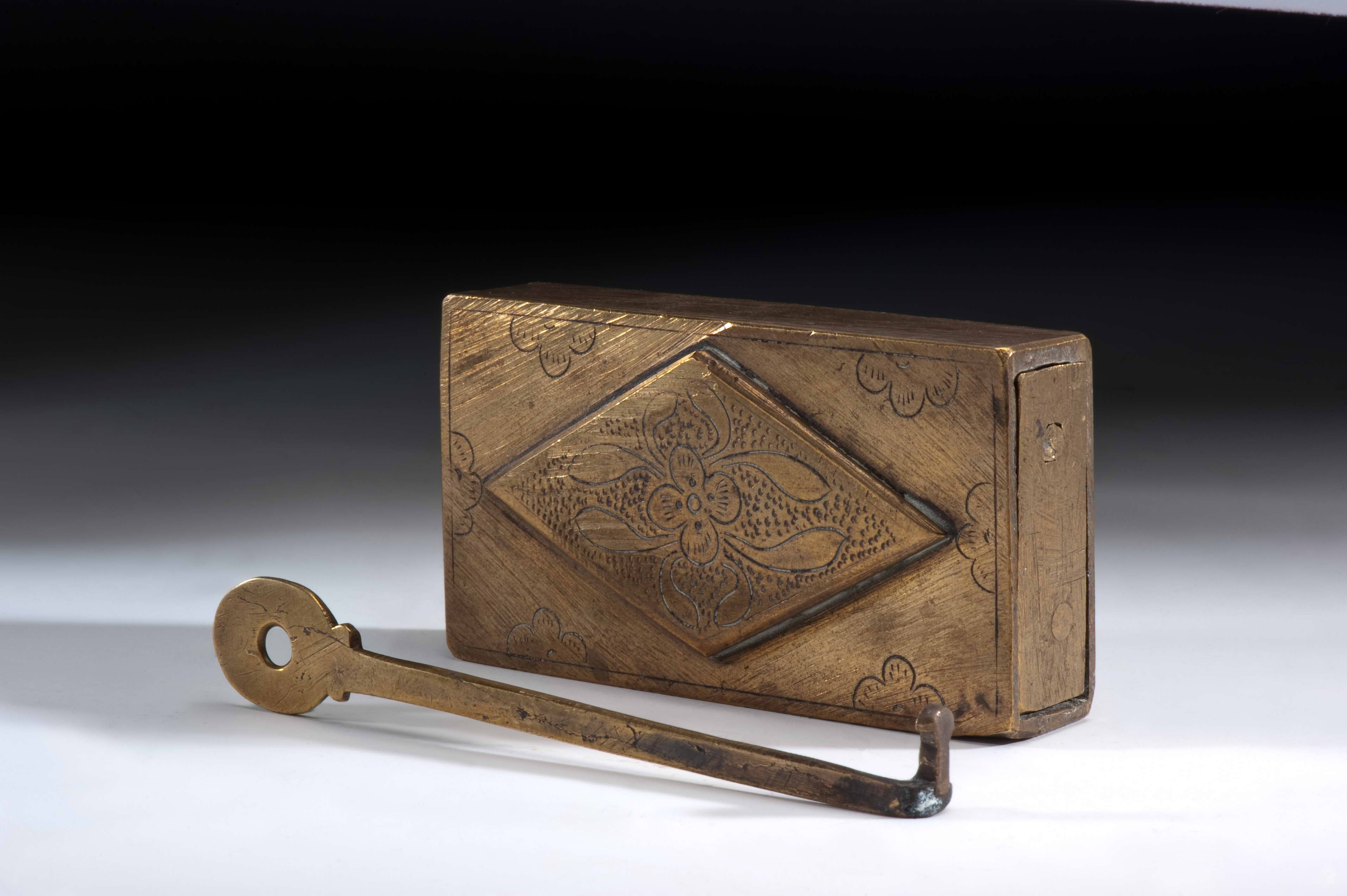 特色:根據設計原理的不同,古中國的鎖具可分為簧片掛鎖與組合鎖兩大類。簧片掛鎖是古中國最常使用的鎖具,其利用簡單的彈簧彈力及巧妙的幾何尺寸安排,配合鑰匙的設計,產生開鎖與閉鎖的功能。根據外型的不同,又可以分成廣鎖與花旗鎖兩類。廣鎖大多為銅質,外形似長方體,其鑰匙孔多位於鎖體側邊,少數位於鎖體正面或底面,廣泛應用於各種門窗、抽屜、及箱子中。花旗鎖的稱呼,來自於其特殊且多樣化的外形,除具有保護、防護的作用之外,亦深具藝術價值。此物件為特殊形狀的廣鎖。