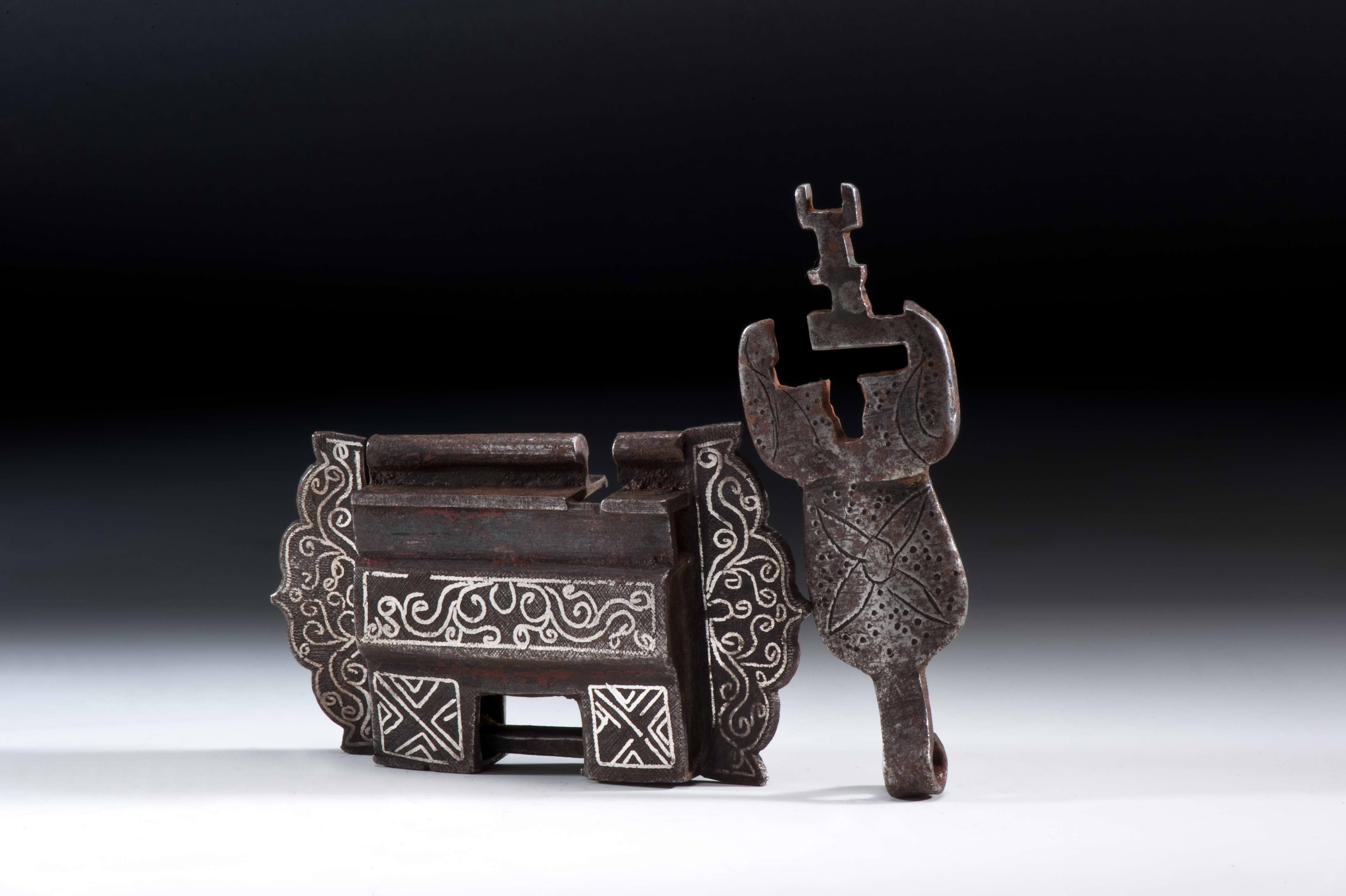 特色:根據設計原理的不同,古中國的鎖具可分為簧片掛鎖與組合鎖兩大類。簧片掛鎖是古中國最常使用的鎖具,其利用簡單的彈簧彈力及巧妙的幾何尺寸安排,配合鑰匙的設計,產生開鎖與閉鎖的功能。根據外型的不同,又可以分成廣鎖與花旗鎖兩類。廣鎖大多為銅質,外形似長方體,其鑰匙孔多位於鎖體側邊,少數位於鎖體正面或底面,廣泛應用於各種門窗、抽屜、及箱子中。花旗鎖的稱呼,來自於其特殊且多樣化的外形,除具有保護、防護的作用之外,亦深具藝術價值。此物件為開放式鎖孔的廣鎖。