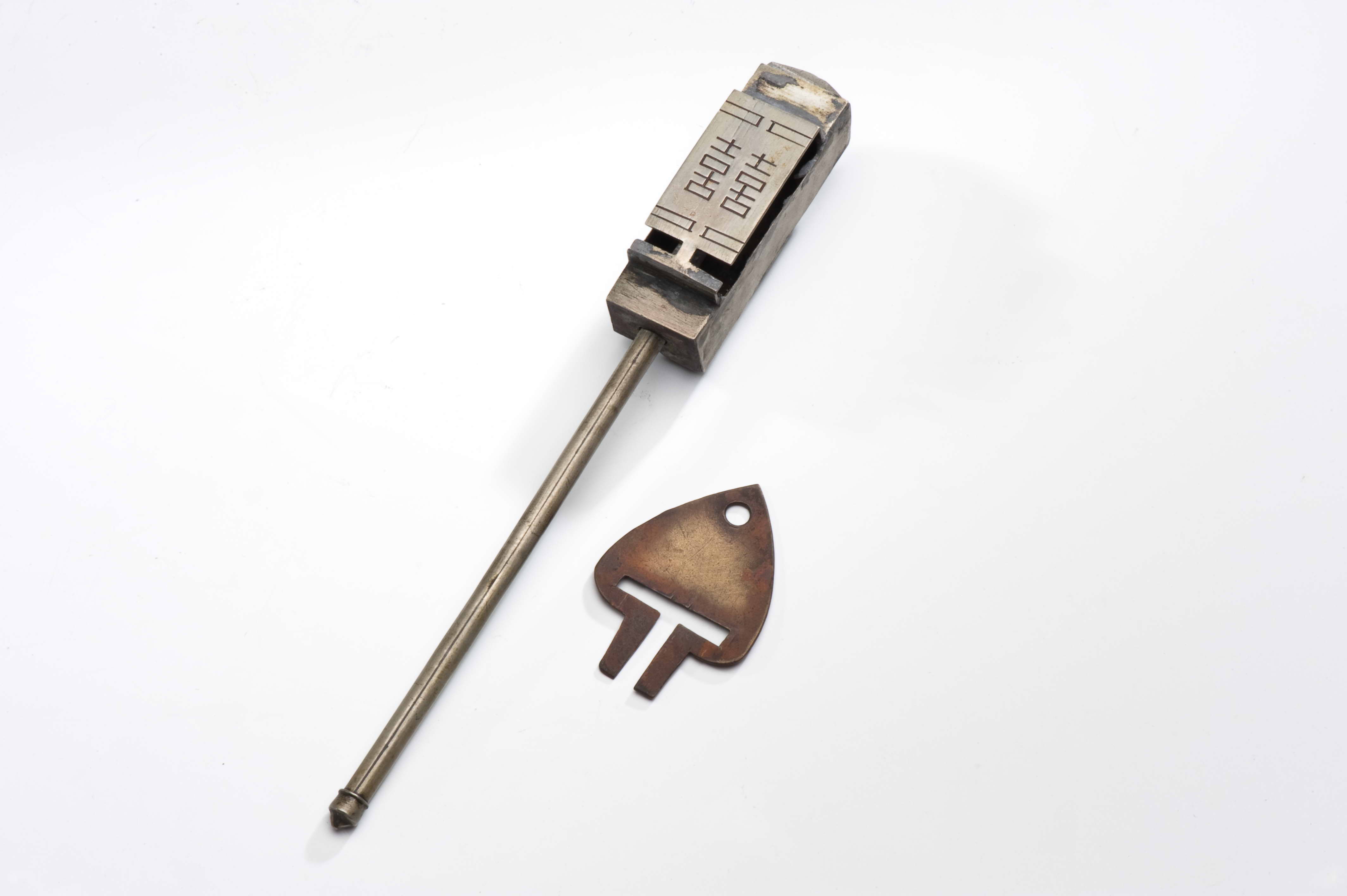 特色:根據設計原理的不同,古中國的鎖具可分為簧片掛鎖與組合鎖兩大類。簧片掛鎖是古中國最常使用的鎖具,其利用簡單的彈簧彈力及巧妙的幾何尺寸安排,配合鑰匙的設計,產生開鎖與閉鎖的功能。根據外型的不同,又可以分成廣鎖與花旗鎖兩類。廣鎖大多為銅質,外形似長方體,其鑰匙孔多位於鎖體側邊,少數位於鎖體正面或底面,廣泛應用於各種門窗、抽屜、及箱子中。花旗鎖的稱呼,來自於其特殊且多樣化的外形,除具有保護、防護的作用之外,亦深具藝術價值。此物件為開放式鎖孔的廣鎖。