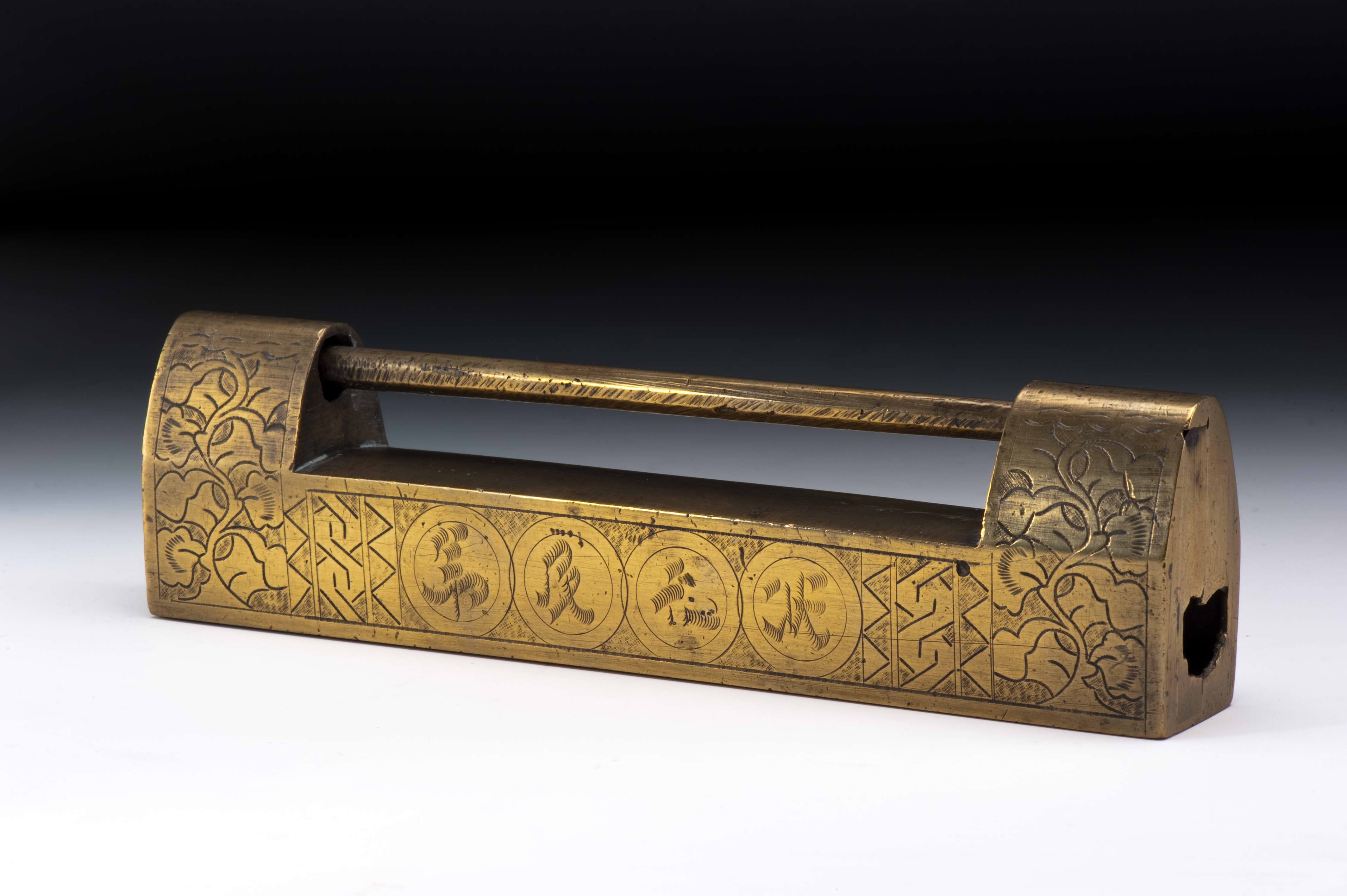 特色:根據設計原理的不同,古中國的鎖具可分為簧片掛鎖與組合鎖兩大類。簧片掛鎖是古中國最常使用的鎖具,其利用簡單的彈簧彈力及巧妙的幾何尺寸安排,配合鑰匙的設計,產生開鎖與閉鎖的功能。根據外型的不同,又可以分成廣鎖與花旗鎖兩類。廣鎖大多為銅質,外形似長方體,其鑰匙孔多位於鎖體側邊,少數位於鎖體正面或底面,廣泛應用於各種門窗、抽屜、及箱子中。花旗鎖的稱呼,來自於其特殊且多樣化的外形,除具有保護、防護的作用之外,亦深具藝術價值。此物件為蝕刻文字的廣鎖。