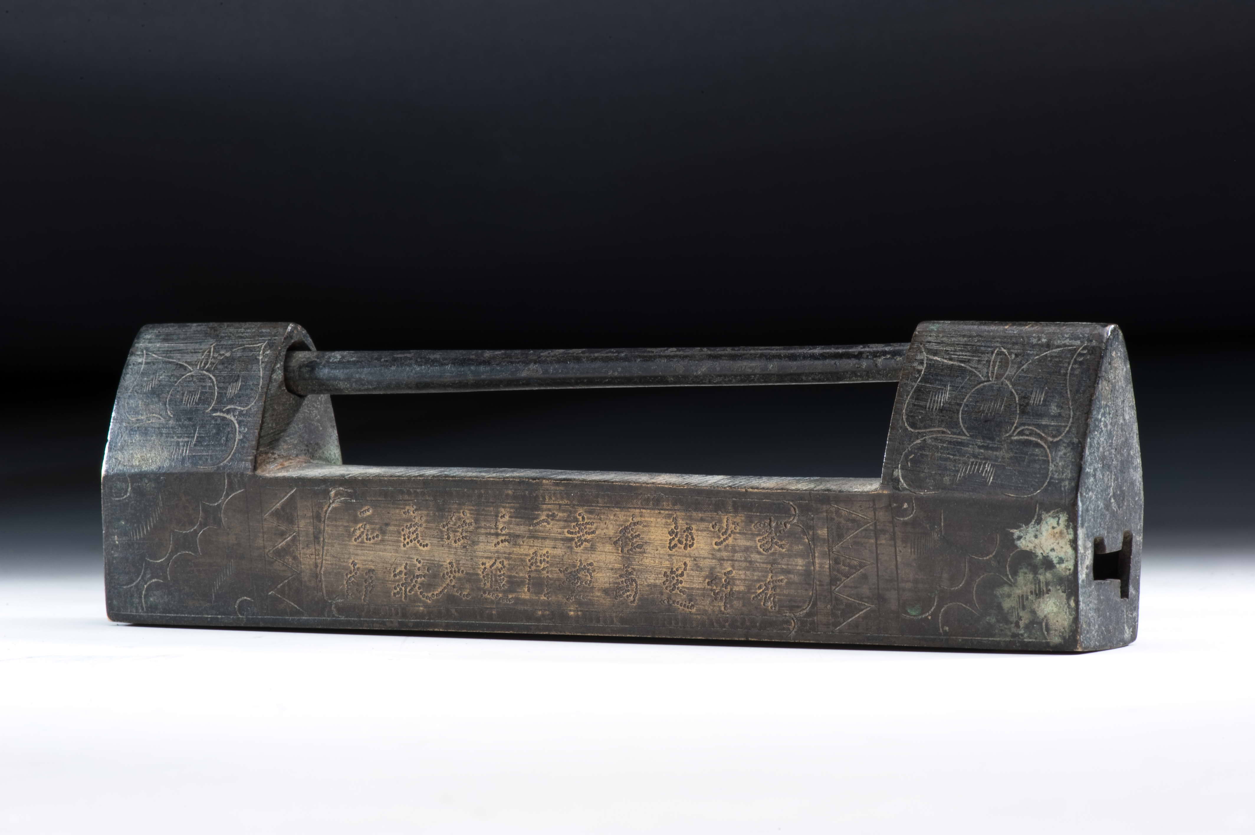 特色:根據設計原理的不同,古中國的鎖具可分為簧片掛鎖與組合鎖兩大類。簧片掛鎖是古中國最常使用的鎖具,其利用簡單的彈簧彈力及巧妙的幾何尺寸安排,配合鑰匙的設計,產生開鎖與閉鎖的功能。根據外型的不同,又可以分成廣鎖與花旗鎖兩類。廣鎖大多為銅質,外形似長方體,其鑰匙孔多位於鎖體側邊,少數位於鎖體正面或底面,廣泛應用於各種門窗、抽屜、及箱子中。花旗鎖的稱呼,來自於其特殊且多樣化的外形,除具有保護、防護的作用之外,亦深具藝術價值。此物件為蝕刻文字的廣鎖。