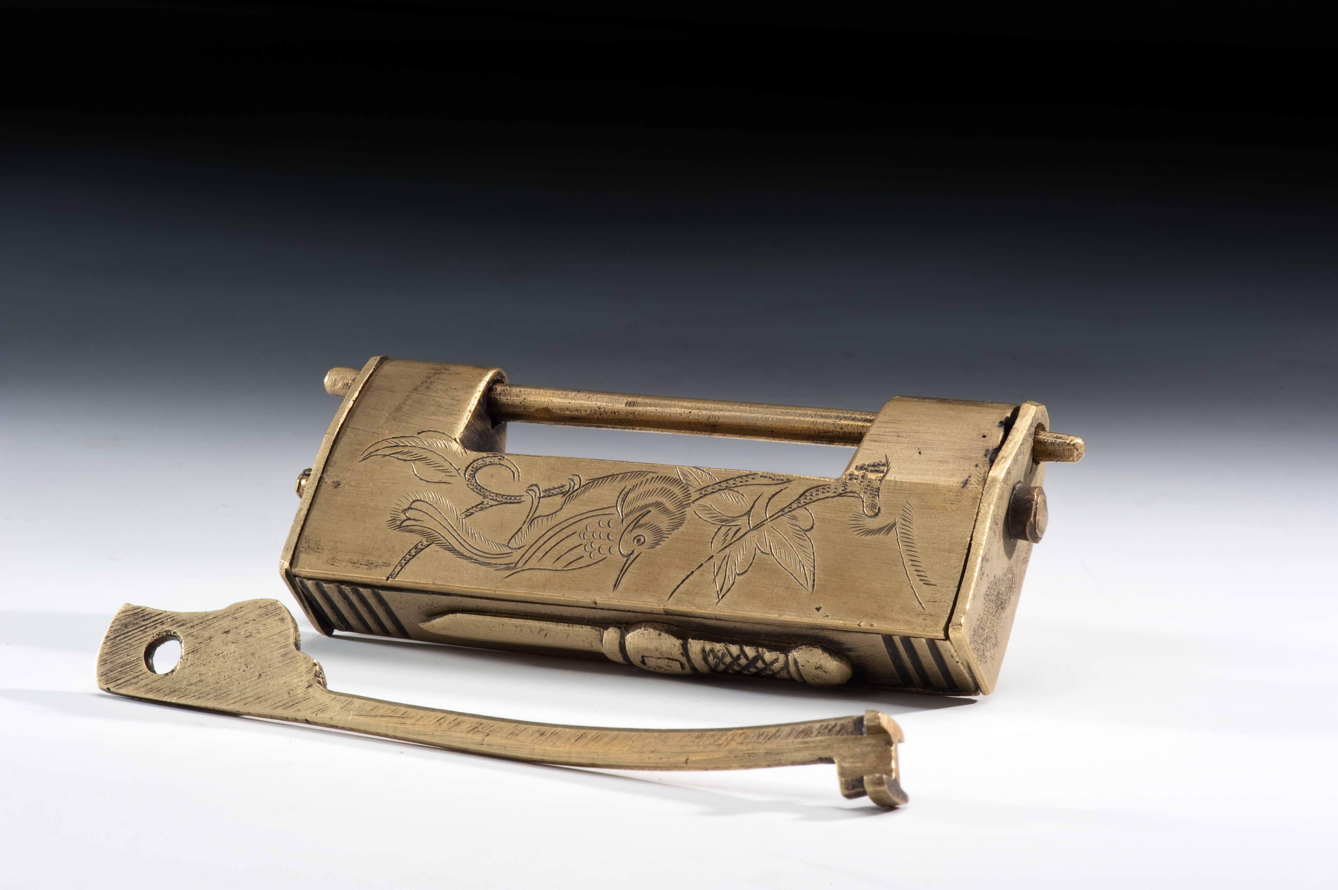 特色:根據設計原理的不同,古中國的鎖具可分為簧片掛鎖與組合鎖兩大類。簧片掛鎖是古中國最常使用的鎖具,其利用簡單的彈簧彈力及巧妙的幾何尺寸安排,配合鑰匙的設計,產生開鎖與閉鎖的功能。根據外型的不同,又可以分成廣鎖與花旗鎖兩類。廣鎖大多為銅質,外形似長方體,其鑰匙孔多位於鎖體側邊,少數位於鎖體正面或底面,廣泛應用於各種門窗、抽屜、及箱子中。花旗鎖的稱呼,來自於其特殊且多樣化的外形,除具有保護、防護的作用之外,亦深具藝術價值。此物件為隱藏式鎖孔的廣鎖。