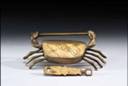 特色:根據設計原理的不同,古中國的鎖具可分為簧片掛鎖與組合鎖兩大類。簧片掛鎖是古中國最常使用的鎖具,其利用簡單的彈簧彈力及巧妙的幾何尺寸安排,配合鑰匙的設計,產生開鎖與閉鎖的功能。根據外型的不同,又可以分成廣鎖與花旗鎖兩類。廣鎖的正面呈凹字狀。「花旗鎖」常用於鎖抽屜、鎖櫃、鎖箱、…等,「花」是指花樣,「旗」則有表示的意思,其名稱來自於其特殊且多樣化的外形,可概分為人物、動物、樂器、字形、用品、及其它等類型,除了含有特定的寓意與吉祥之意外,亦兼具裝飾功能。再者,花旗鎖大多為銅質,鐫雕洗練,工寫兼蓄,作工精緻傳神,頗富民族傳統色彩。此物件為螃蟹外型的花旗鎖。