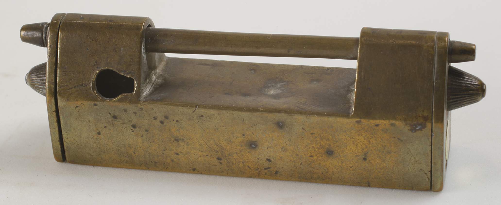 特色:根據設計原理的不同,古中國的鎖具可分為簧片掛鎖與組合鎖兩大類。簧片掛鎖是古中國最常使用的鎖具,其利用簡單的彈簧彈力及巧妙的幾何尺寸安排,配合鑰匙的設計,產生開鎖與閉鎖的功能。根據外型的不同,又可以分成廣鎖與花旗鎖兩類。廣鎖大多為銅質,外形似長方體,其鑰匙孔多位於鎖體側邊,少數位於鎖體正面或底面,廣泛應用於各種門窗、抽屜、及箱子中。花旗鎖的稱呼,來自於其特殊且多樣化的外形,除具有保護、防護的作用之外,亦深具藝術價值。此物件為隱藏式鎖孔的廣鎖。