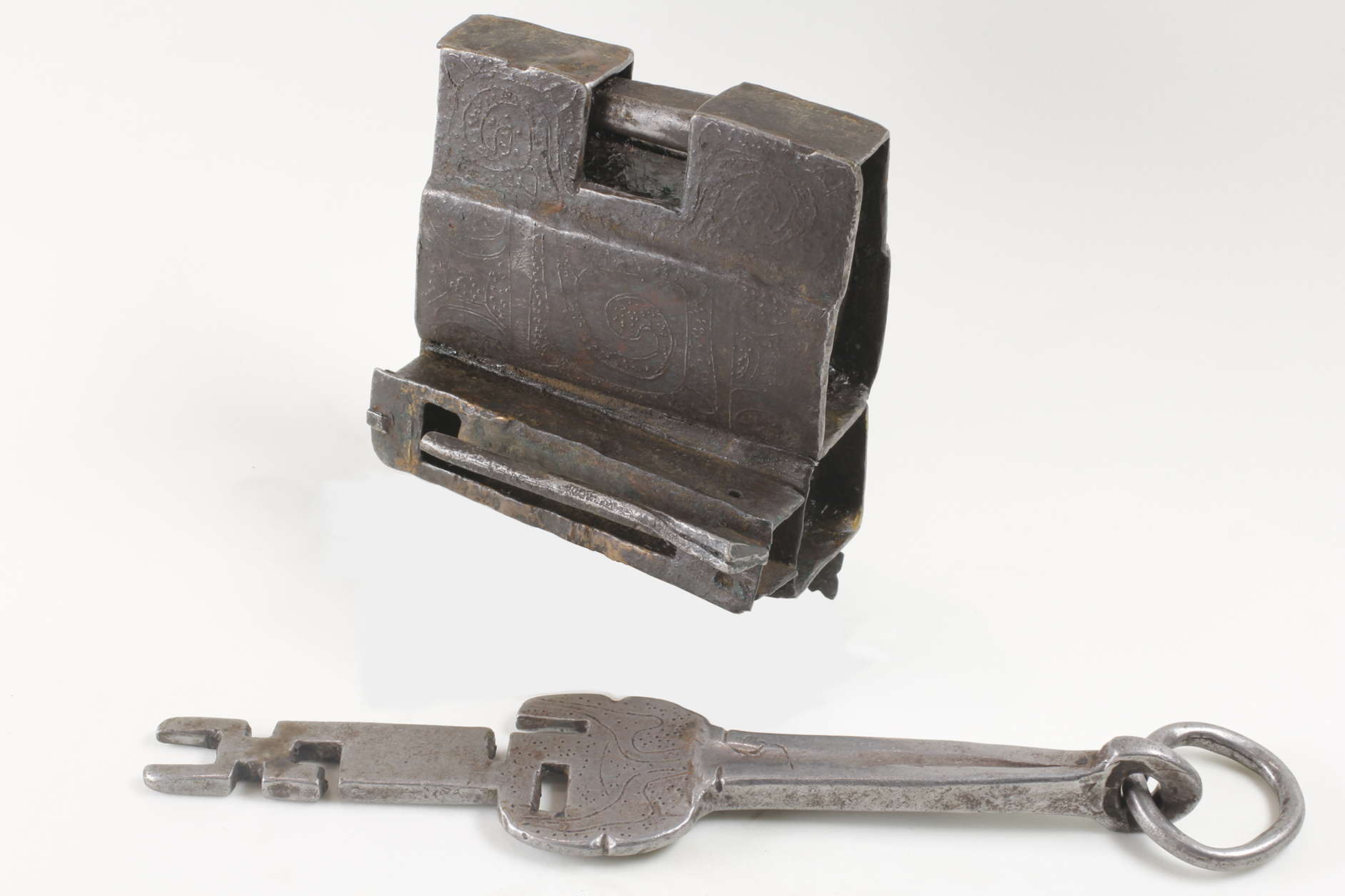 特色:根據設計原理的不同,古中國的鎖具可分為簧片掛鎖與組合鎖兩大類。簧片掛鎖是古中國最常使用的鎖具,其利用簡單的彈簧彈力及巧妙的幾何尺寸安排,配合鑰匙的設計,產生開鎖與閉鎖的功能。根據外型的不同,又可以分成廣鎖與花旗鎖兩類。廣鎖大多為銅質,外形似長方體,其鑰匙孔多位於鎖體側邊,少數位於鎖體正面或底面,廣泛應用於各種門窗、抽屜、及箱子中。花旗鎖的稱呼,來自於其特殊且多樣化的外形,除具有保護、防護的作用之外,亦深具藝術價值。此物件為特殊外形的廣鎖。