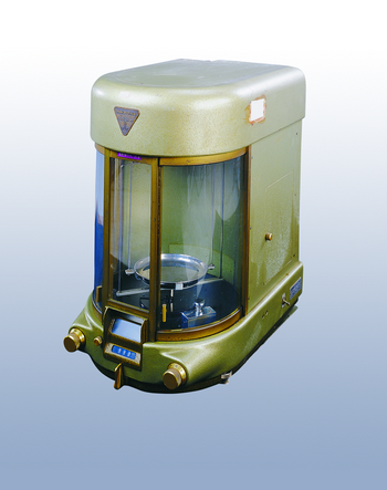 測量較小物體重量用。測量精度600公克/10毫克(最大秤量/感量)。瑞士製。於1960年代製造使用。