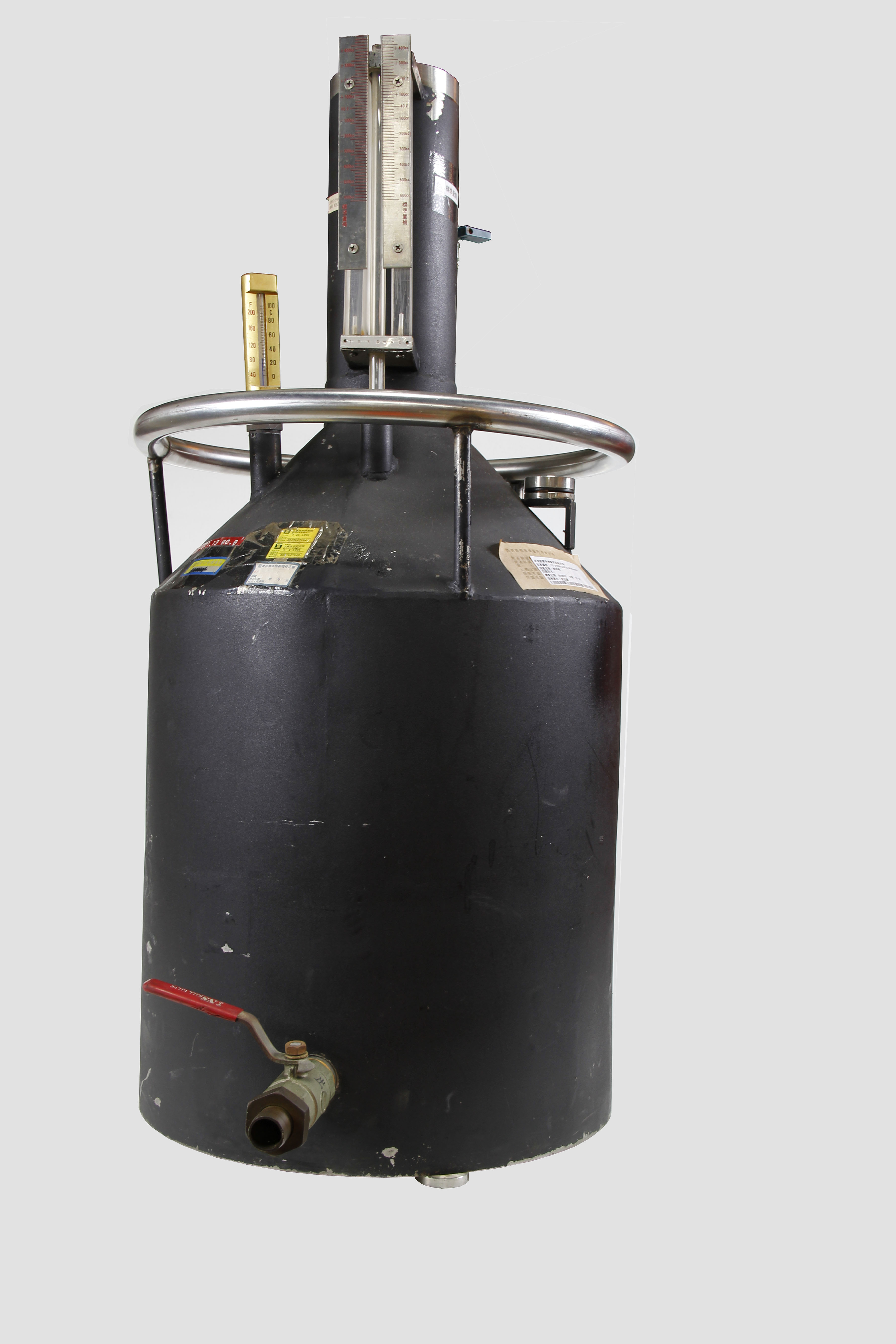 特色:油量計(加油機)的檢定、檢查用。容量為40公升。油量計之檢定、檢查,係將油料注入標準量桶至所需檢定油量時,關閉控流閥,使加油槍口滴油5秒後,執行比較,看量桶容量與出油量是否相同(不超過誤差值)。自民國92年7月1日「 液體用量器檢定檢查技術規範(CNMV 45)」開始實施後,此40公升量桶因非公告標準容量之量器,而不再使用。