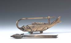 特色:根據設計原理的不同,古中國的鎖具可分為簧片掛鎖與組合鎖兩大類。簧片掛鎖是古中國最常使用的鎖具,其利用簡單的彈簧彈力及巧妙的幾何尺寸安排,配合鑰匙的設計,產生開鎖與閉鎖的功能。根據外型的不同,又可以分成廣鎖與花旗鎖兩類。廣鎖的正面呈凹字狀。「花旗鎖」常用於鎖抽屜、鎖櫃、鎖箱、…等,「花」是指花樣,「旗」則有表示的意思,其名稱來自於其特殊且多樣化的外形,可概分為人物、動物、樂器、字形、用品、及其它等類型,除了含有特定的寓意與吉祥之意外,亦兼具裝飾功能。再者,花旗鎖大多為銅質,鐫雕洗練,工寫兼蓄,作工精緻傳神,頗富民族傳統色彩。此物件為魚外型的花旗鎖。