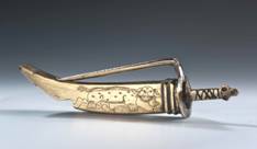 根據設計原理的不同,古中國的鎖具可分為簧片掛鎖與組合鎖兩大類。簧片掛鎖是古中國最常使用的鎖具,其利用簡單的彈簧彈力及巧妙的幾何尺寸安排,配合鑰匙的設計,產生開鎖與閉鎖的功能。根據外型的不同,又可以分成廣鎖與花旗鎖兩類。廣鎖的正面呈凹字狀。「花旗鎖」常用於鎖抽屜、鎖櫃、鎖箱、…等,「花」是指花樣,「旗」則有表示的意思,其名稱來自於其特殊且多樣化的外形,可概分為人物、動物、樂器、字形、用品、及其它等類型,除了含有特定的寓意與吉祥之意外,亦兼具裝飾功能。再者,花旗鎖大多為銅質,鐫雕洗練,工寫兼蓄,作工精緻傳神,頗富民族傳統色彩。此物件為彎刀外型的花旗鎖。