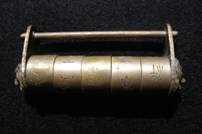 根據設計原理的不同,古中國的鎖具可分為簧片掛鎖與組合鎖兩大類。簧片掛鎖是古中國最常使用的鎖具,其利用簡單的彈簧彈力及巧妙的幾何尺寸安排,配合鑰匙的設計,產生開鎖與閉鎖的功能。組合鎖通常具有三至七個轉輪。鎖體呈橫式圓柱體形狀,在圓柱之軸蕊上排列著數只同樣大小、且均能轉動的轉輪,每個轉輪之表面蝕刻著同樣數目的文字,只要所有轉輪上的文字轉到定位,且文字形成特定的字串,就可開鎖。此物件為五個轉輪的組合鎖。