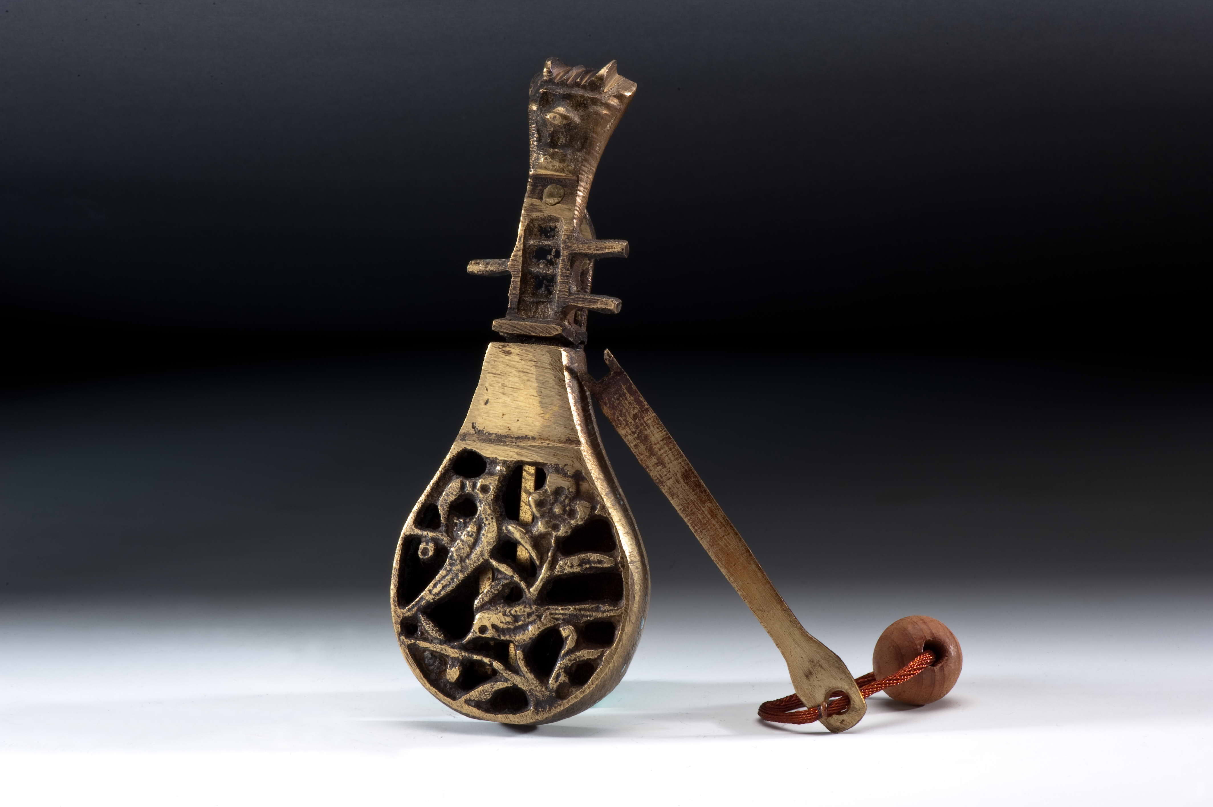 Characteristics:According to the design principle, ancient Chinese locks have two types including the splitting spring lock and the combination lock. The splitting spring lock is most popular one in ancient Chinese. It uses the simple elasticity and the clever dimensions to tie in with the design of key. The locking and opening functions are generated. According to the outer shapes, the splitting spring locks have two types including broad lock and pattern lock. The front side of broad lock is of the shape of the character "凹". Pattern locks were widely used for locking drawers, closets, and chests, … etc. Exploring the linguistic origin of the pattern locks, "Hua (花)" means “floral pattern” and "Qi (旗)" means "represent". Pattern locks get their names from the various, peculiar shapes of the locks. They can be roughly classified into the types of human figures, animals, musical instruments, letters, utensils, and others. The outer appearance of pattern locks is not just for special intentions and good fortunes, but also carries the purpose of decoration. Most pattern locks are made of bronze. The engravings on the locks are delicate, polished, and artistically fine though simple in style. The images engraved are vivid and alive. And, pattern locks are enriched with traditional civil arts and folk arts. This object is a pattern lock with balloon-guitar shape.