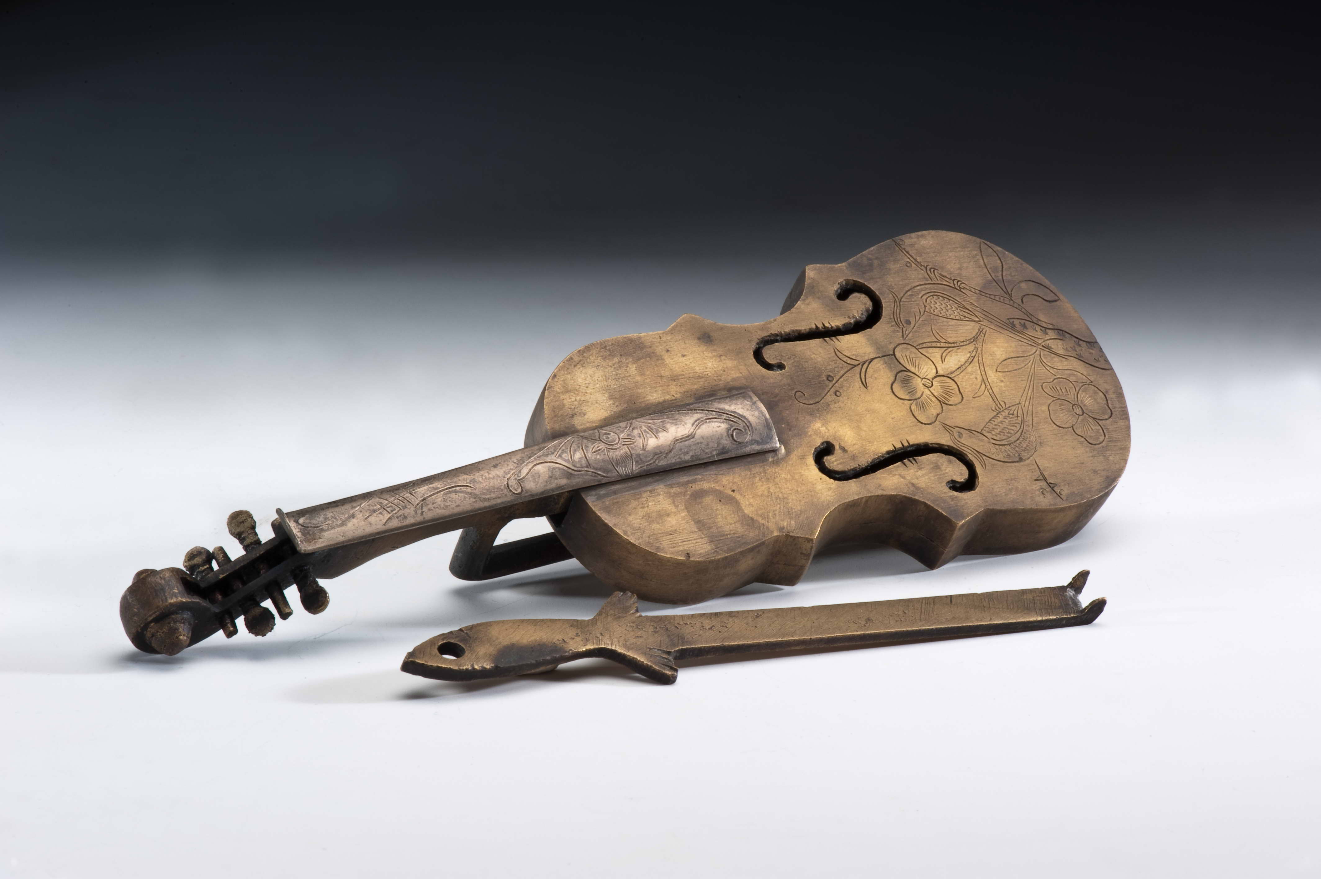 Characteristics:According to the design principle, ancient Chinese locks have two types including the splitting spring lock and the combination lock. The splitting spring lock is most popular one in ancient Chinese. It uses the simple elasticity and the clever dimensions to tie in with the design of key. The locking and opening functions are generated. According to the outer shapes, the splitting spring locks have two types including broad lock and pattern lock. The front side of broad lock is of the shape of the character "凹". Pattern locks were widely used for locking drawers, closets, and chests, … etc. Exploring the linguistic origin of the pattern locks, "Hua (花)" means “floral pattern” and "Qi (旗)" means "represent". Pattern locks get their names from the various, peculiar shapes of the locks. They can be roughly classified into the types of human figures, animals, musical instruments, letters, utensils, and others. The outer appearance of pattern locks is not just for special intentions and good fortunes, but also carries the purpose of decoration. Most pattern locks are made of bronze. The engravings on the locks are delicate, polished, and artistically fine though simple in style. The images engraved are vivid and alive. And, pattern locks are enriched with traditional civil arts and folk arts. This object is a pattern lock with guitar shape.