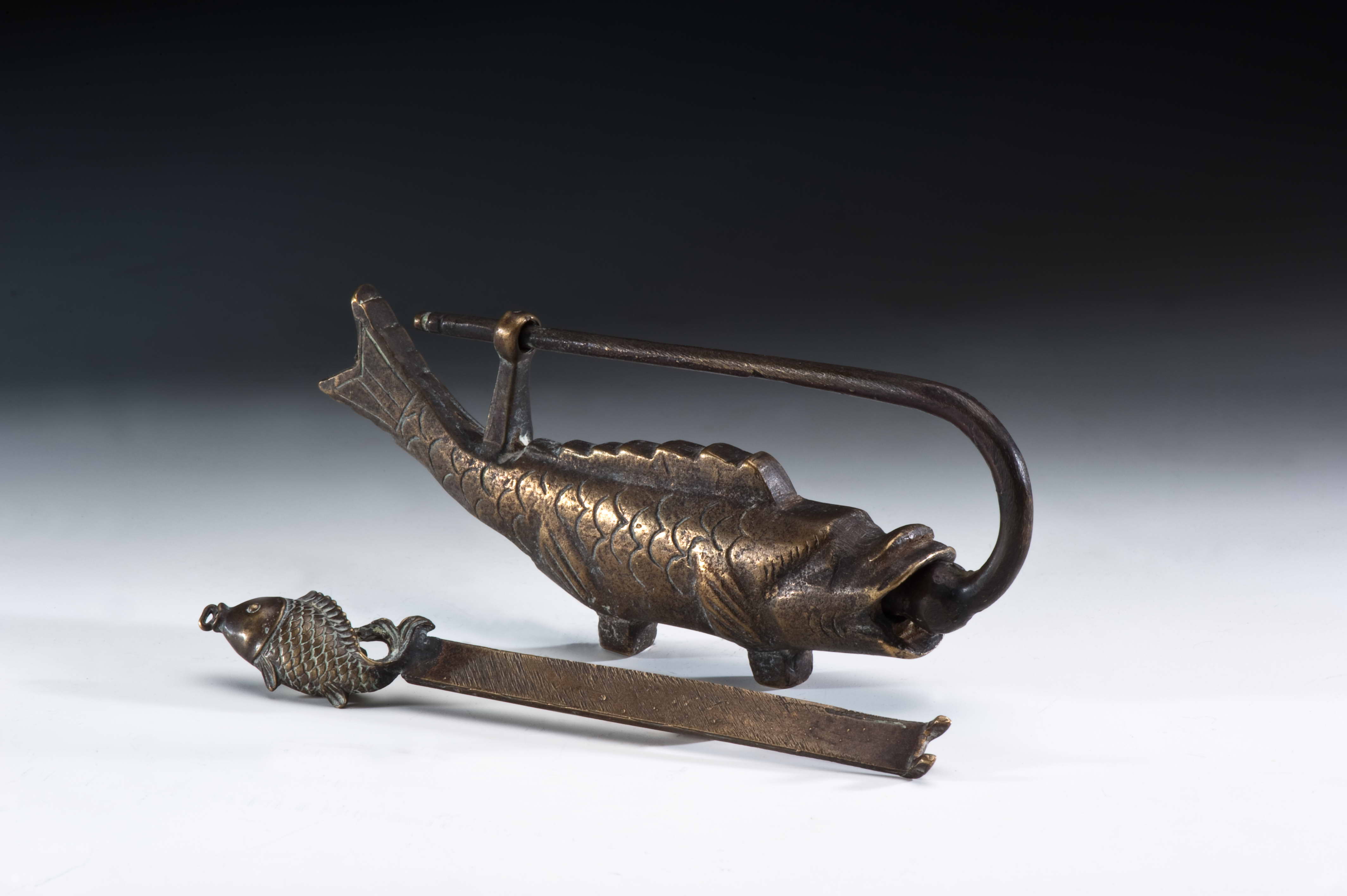Characteristics:According to the design principle, ancient Chinese locks have two types including the splitting spring lock and the combination lock. The splitting spring lock is most popular one in ancient Chinese. It uses the simple elasticity and the clever dimensions to tie in with the design of key. The locking and opening functions are generated. According to the outer shapes, the splitting spring locks have two types including broad lock and pattern lock. The front side of broad lock is of the shape of the character "凹". Pattern locks were widely used for locking drawers, closets, and chests, … etc. Exploring the linguistic origin of the pattern locks, "Hua (花)" means “floral pattern” and "Qi (旗)" means "represent". Pattern locks get their names from the various, peculiar shapes of the locks. They can be roughly classified into the types of human figures, animals, musical instruments, letters, utensils, and others. The outer appearance of pattern locks is not just for special intentions and good fortunes, but also carries the purpose of decoration. Most pattern locks are made of bronze. The engravings on the locks are delicate, polished, and artistically fine though simple in style. The images engraved are vivid and alive. And, pattern locks are enriched with traditional civil arts and folk arts. This object is a pattern lock with fish shape.