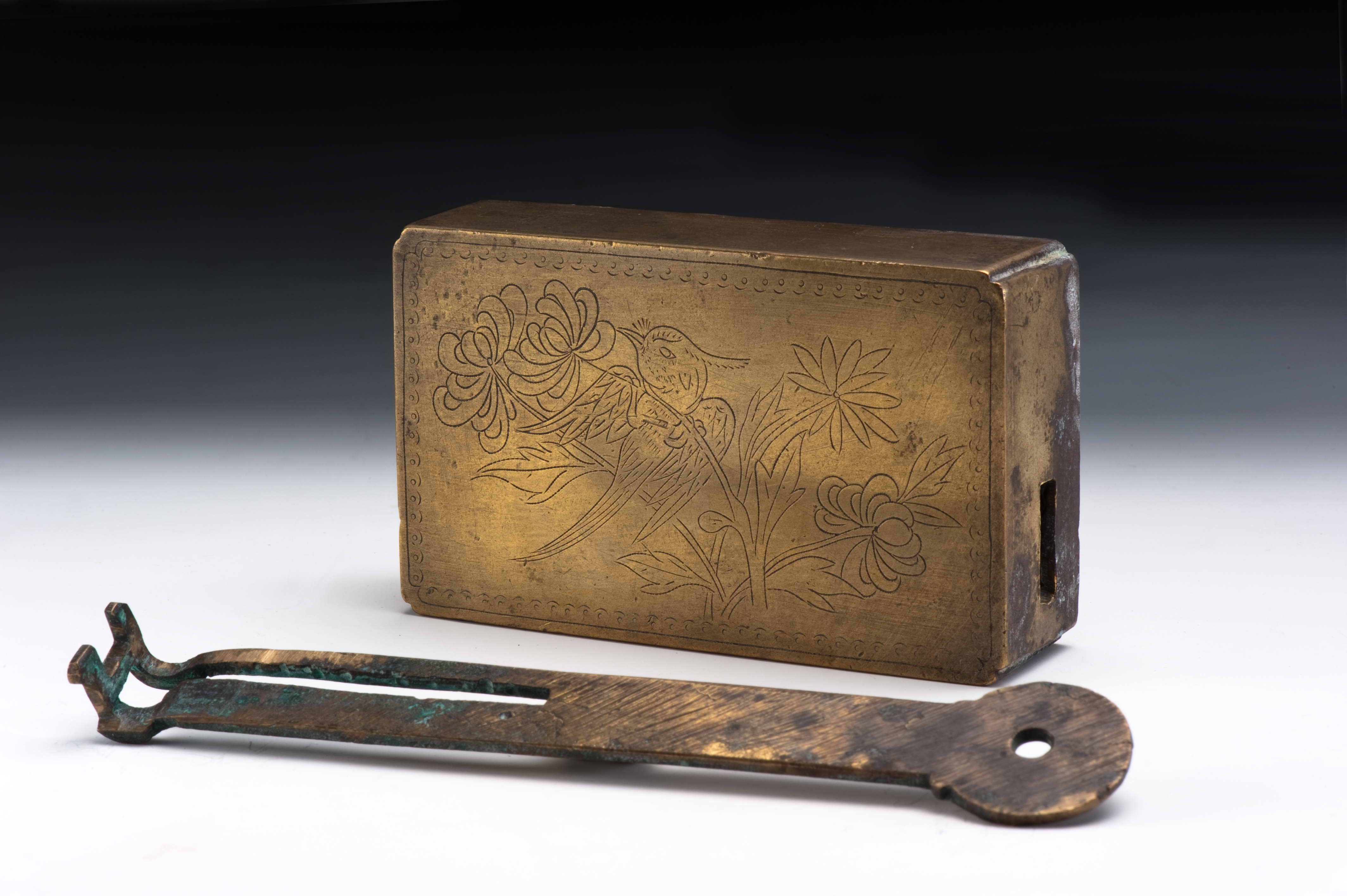 Characteristics:According to the design principle, ancient Chinese locks have two types including the splitting spring lock and the combination lock. The splitting spring lock is most popular one in ancient Chinese. It uses the simple elasticity and the clever dimensions to tie in with the design of key. The locking and opening functions are generated. According to the outer shapes, the splitting spring locks have two types including broad lock and pattern lock. Most broad locks are made of bronze. The shape of broad lock is mostly like a rectangular one. The keyhole is normally on the sidewall of the lock-body. Sometimes it appears on the front side or the bottom side. The broad locks are used in doors, drawers, and boxes. Pattern locks get their names from the various, peculiar shapes of the locks. Not only they are equipped with the functions of protection and security but they are also of artistic value. This object is a broad lock with open keyhole.